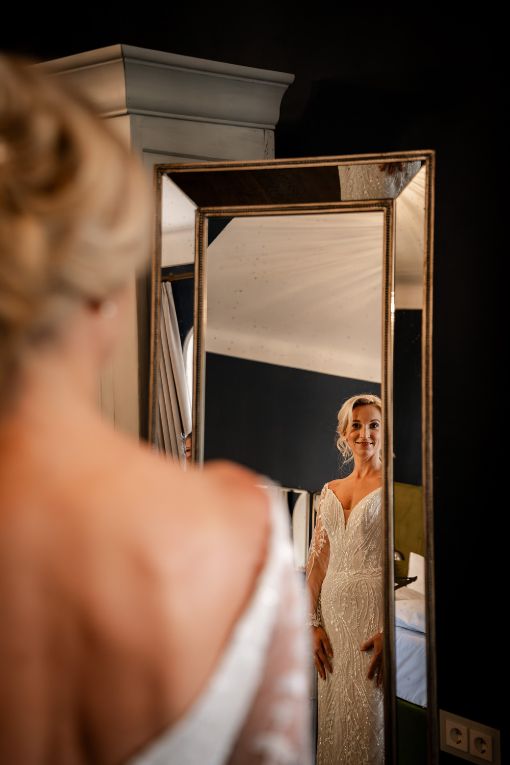 In der eleganten Suite bereitete sich die Braut vor. Zwischen Lachen, zarten Berührungen und dem aufregenden Kribbeln der Vorfreude entstanden stille, intime Augenblicke, die man spüren konnte. Dann kam der erste Blick – und die Welt schien für einen Moment stillzustehen. Emotionen flossen frei: liebevolle Worte, kleine Tränen des Glücks, Lächeln, das alles sagte, was man nicht in Worte fassen kann.