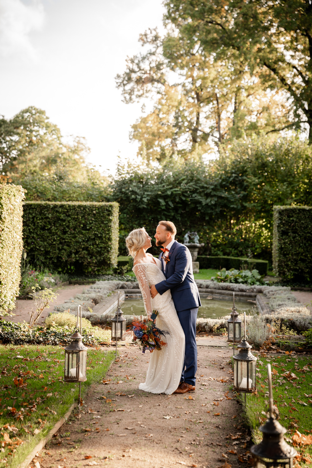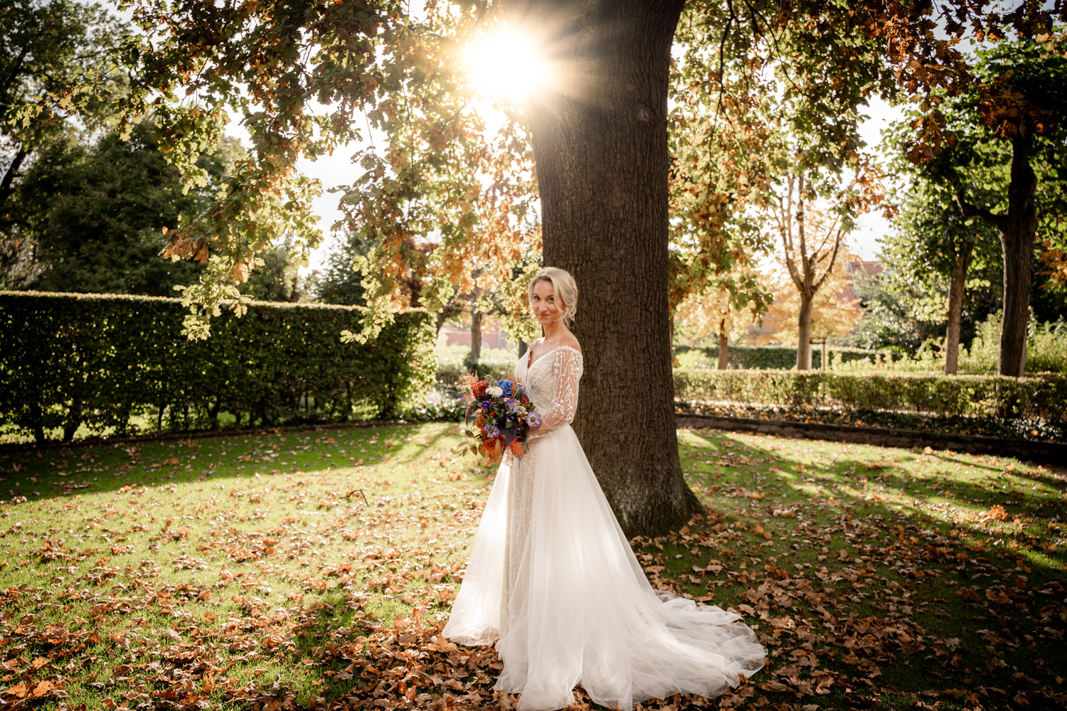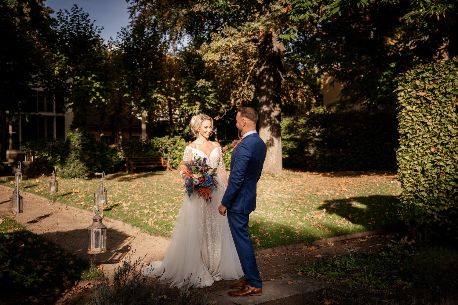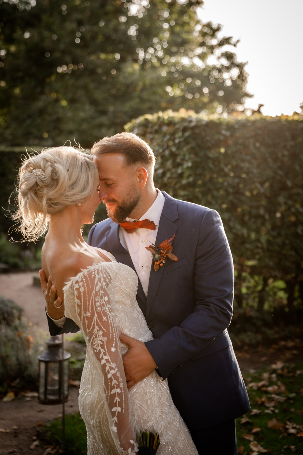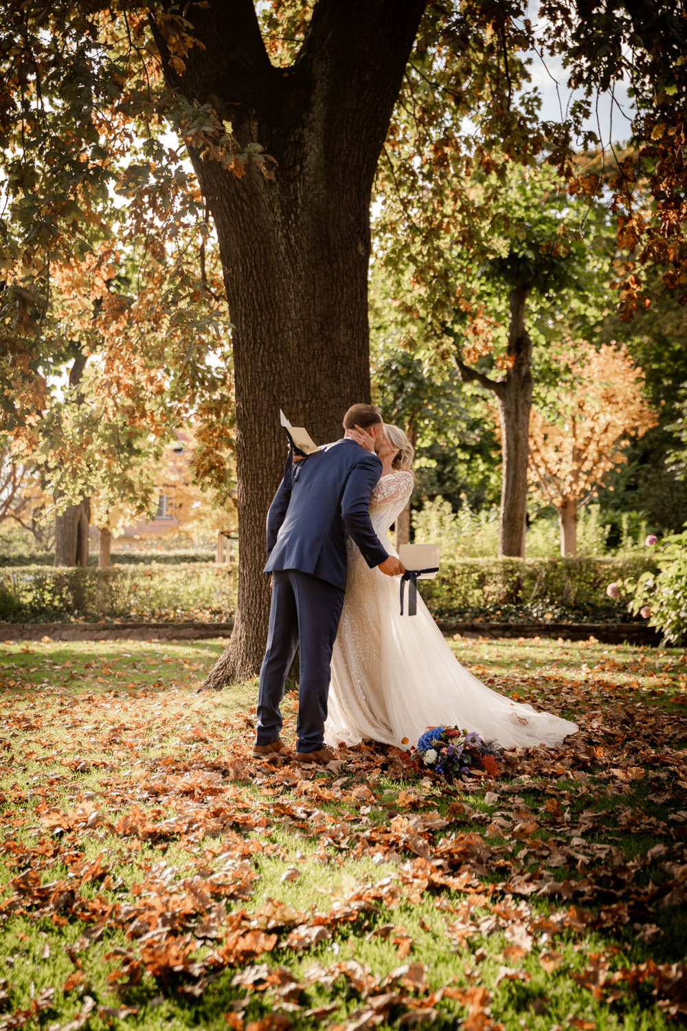Später führte uns der Weg in die weitläufige Parkanlage der Villa. Das Paar schlenderte zwischen herbstlich gefärbten Bäumen, während die Sonne sanft durch die Blätter fiel. Jeder Blick, jede Berührung, jeder Moment schien von der Natur selbst inszeniert – Leichtigkeit, Nähe und echte Liebe in jedem Bild.
