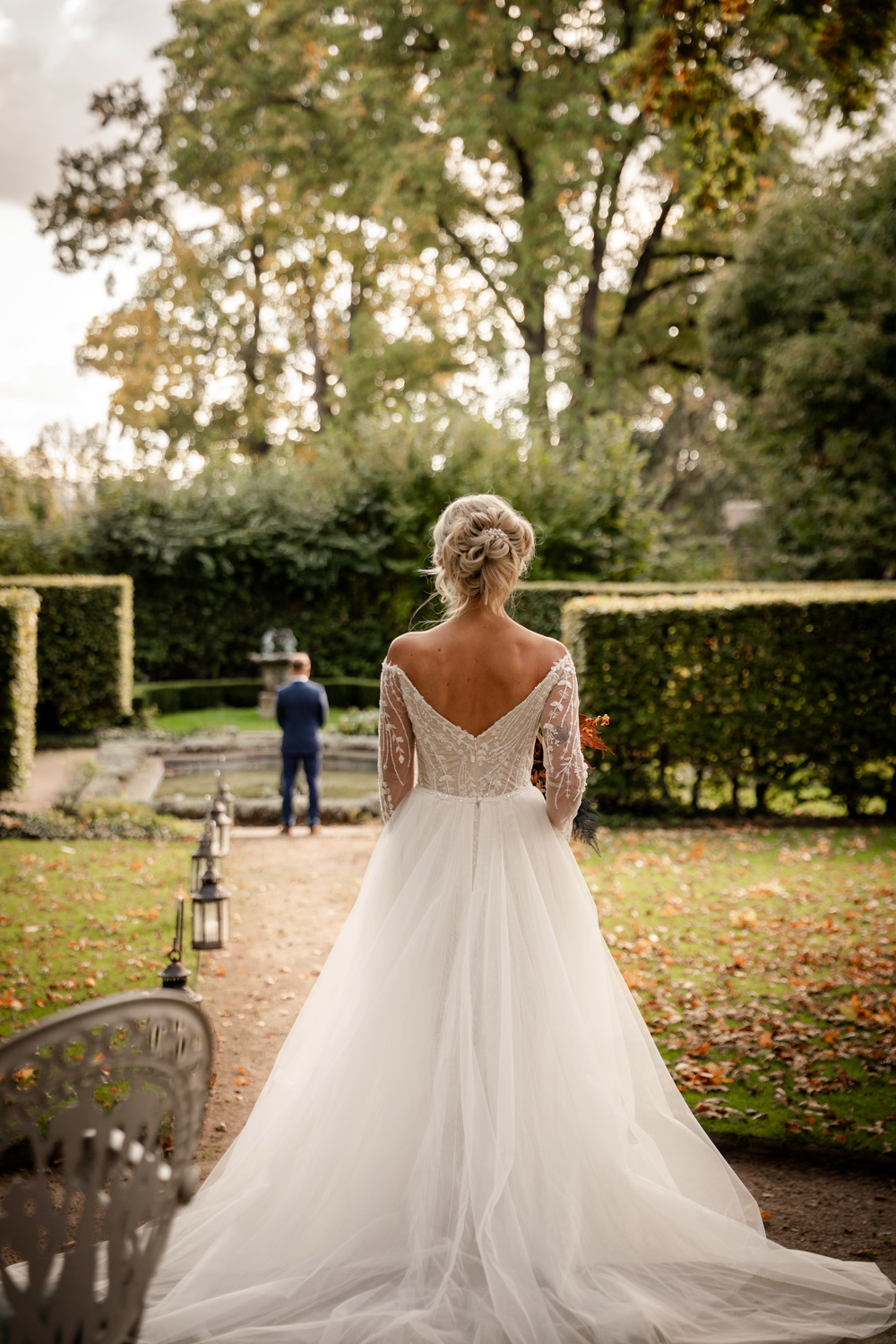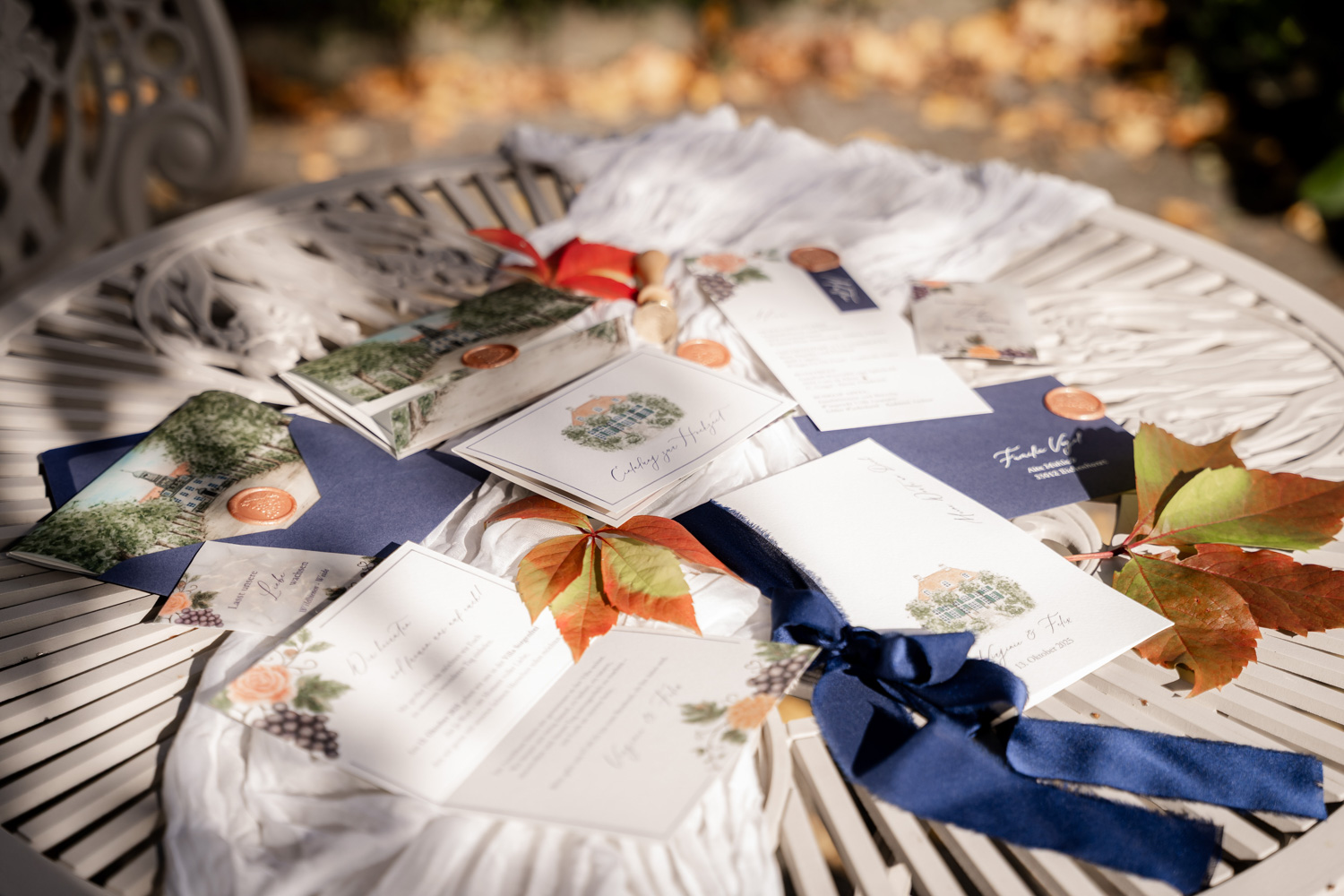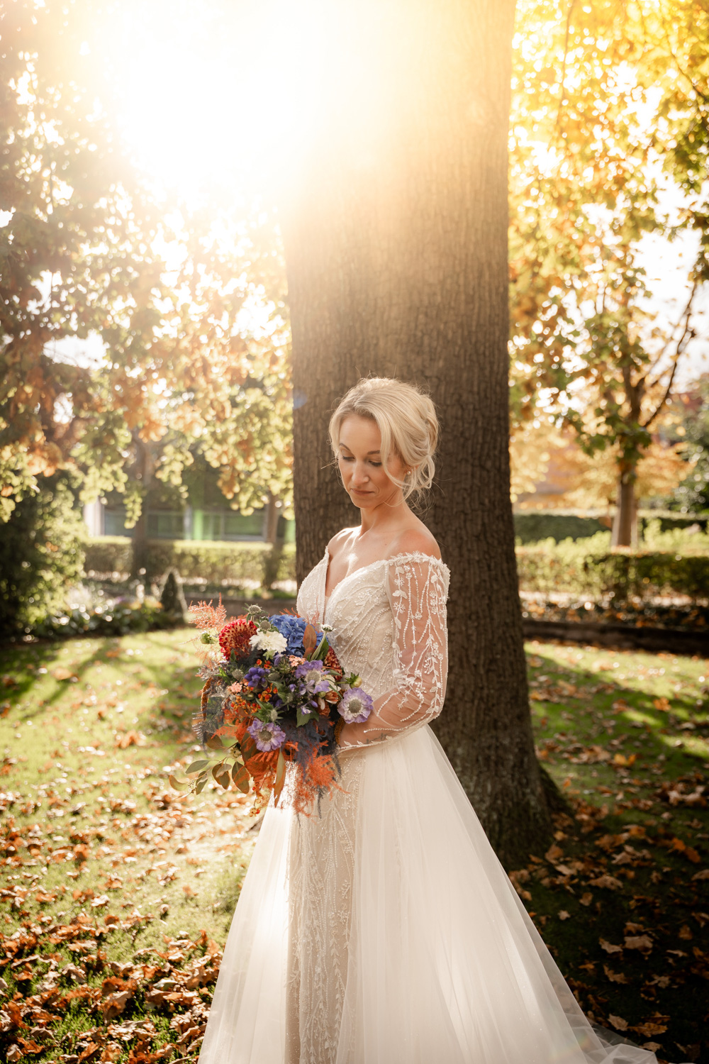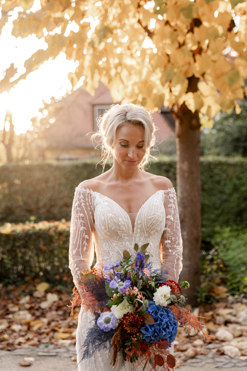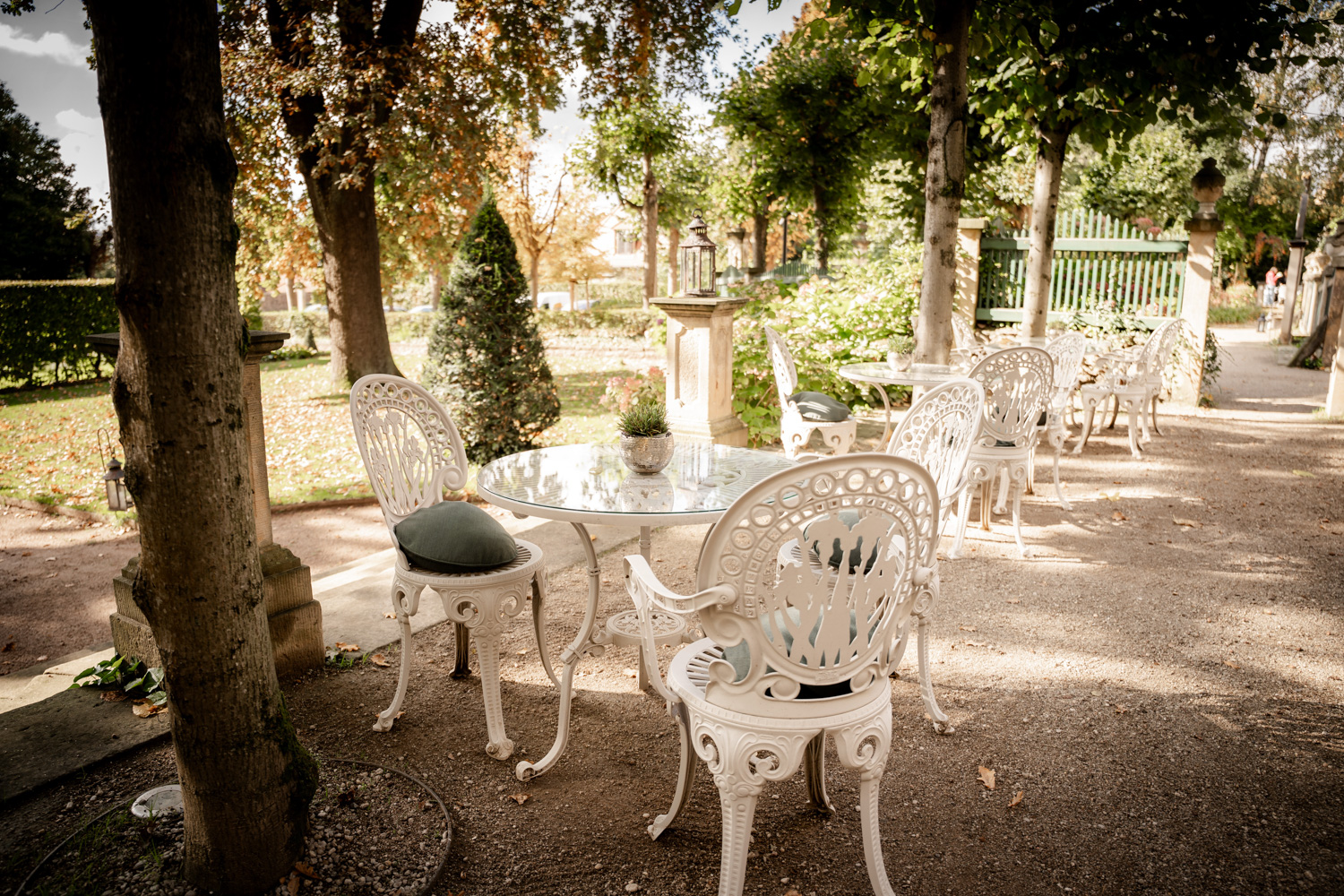 Später führte uns der Weg in die weitläufige Parkanlage der Villa. Das Paar schlenderte zwischen herbstlich gefärbten Bäumen, während die Sonne sanft durch die Blätter fiel. Jeder Blick, jede Berührung, jeder Moment schien von der Natur selbst inszeniert – Leichtigkeit, Nähe und echte Liebe in jedem Bild.