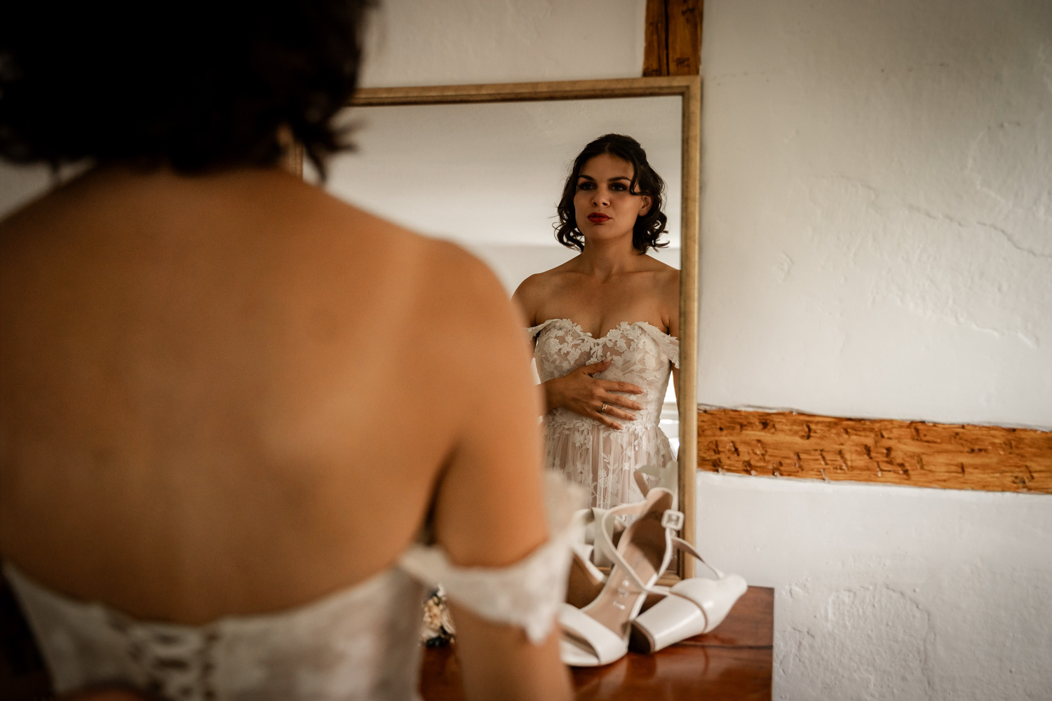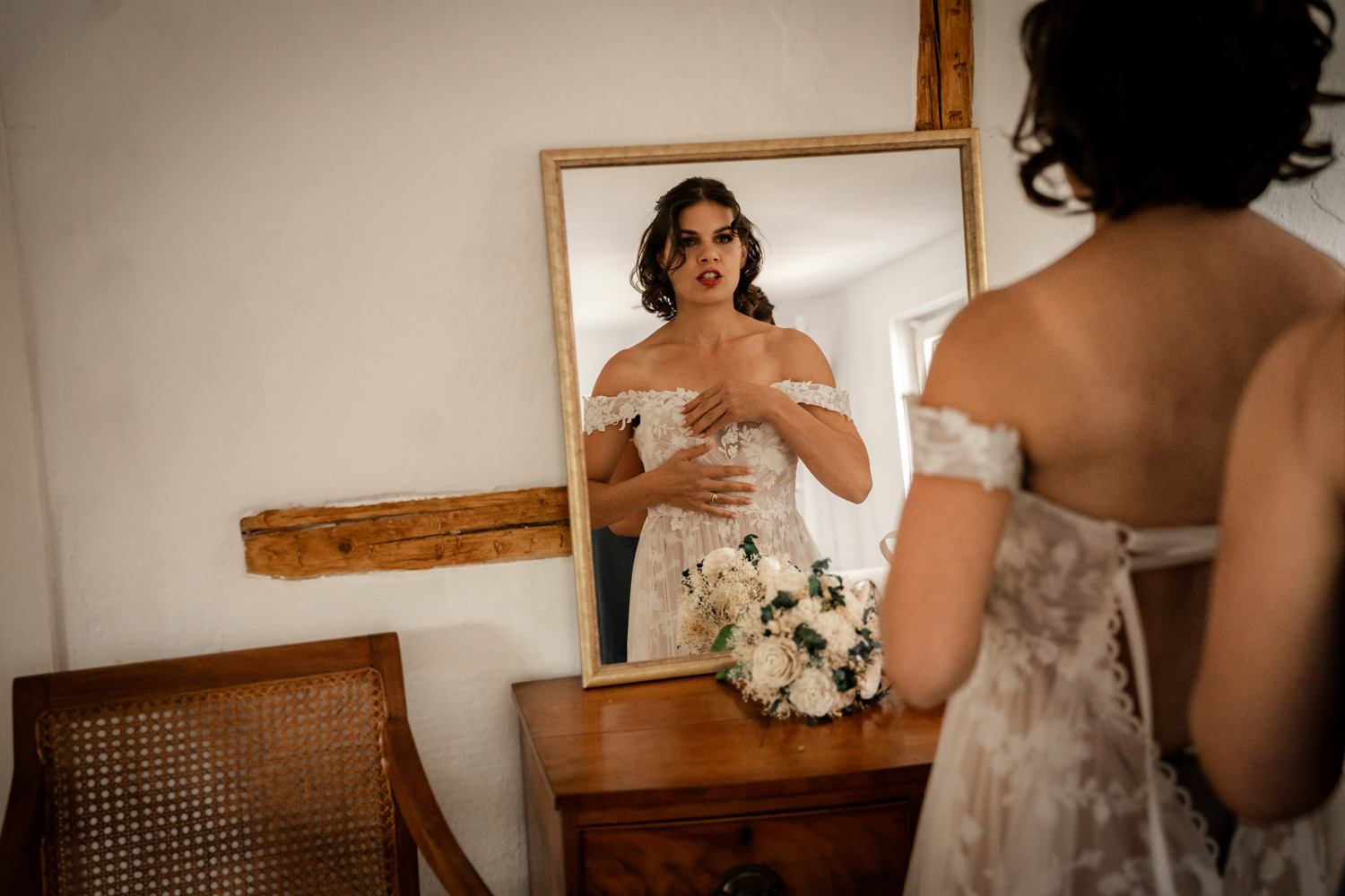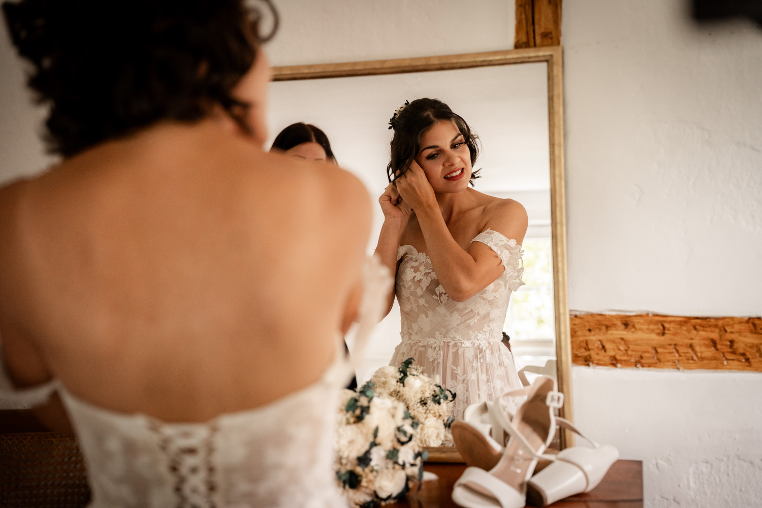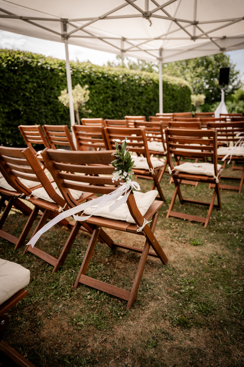 Die freie Trauung fand im weitläufigen Garten statt – ganz entspannt, mit Vogelgezwitscher und dieser ganz besonderen Sommerstille, die nur ländliche Orte haben. Nach der Zeremonie wurde Kaffee im Schatten der Bäume getrunken, gelacht, umarmt, erzählt.Das Getting Ready im Haus war etwas ganz Besonderes: Die lichtdurchfluteten Räume, antiken Möbel und liebevoll ausgewählten Details schufen eine Atmosphäre, in der man sich sofort wohlfühlte – edel, aber warm und persönlich. Ideal, um in Ruhe anzukommen, sich fertig zu machen, vielleicht sogar kurz durchzuatmen.