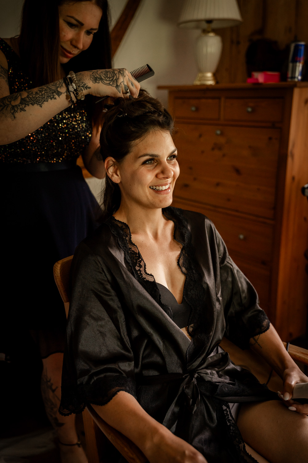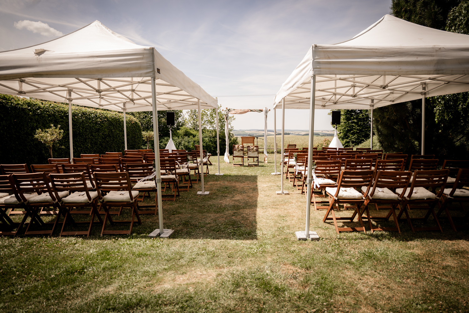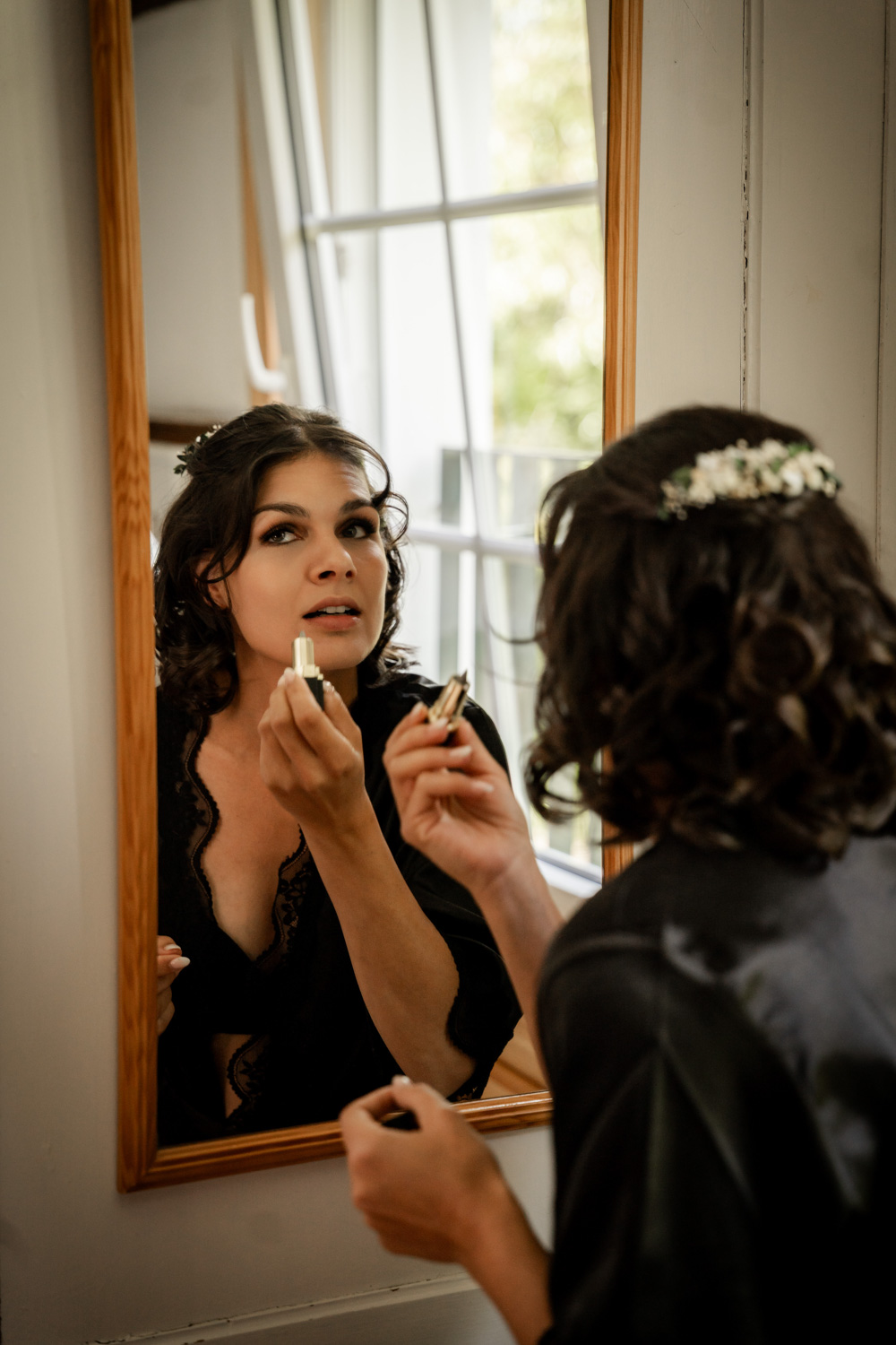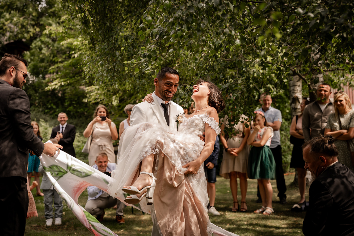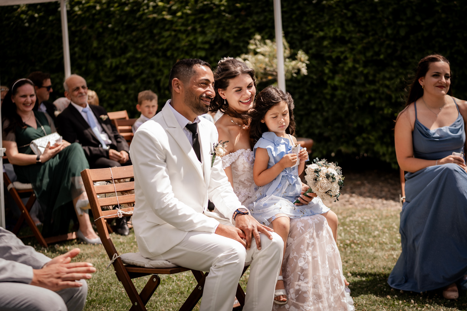 Die freie Trauung fand im weitläufigen Garten statt – ganz entspannt, mit Vogelgezwitscher und dieser ganz besonderen Sommerstille, die nur ländliche Orte haben. Nach der Zeremonie wurde Kaffee im Schatten der Bäume getrunken, gelacht, umarmt, erzählt.Das Getting Ready im Haus war etwas ganz Besonderes: Die lichtdurchfluteten Räume, antiken Möbel und liebevoll ausgewählten Details schufen eine Atmosphäre, in der man sich sofort wohlfühlte – edel, aber warm und persönlich. Ideal, um in Ruhe anzukommen, sich fertig zu machen, vielleicht sogar kurz durchzuatmen.
