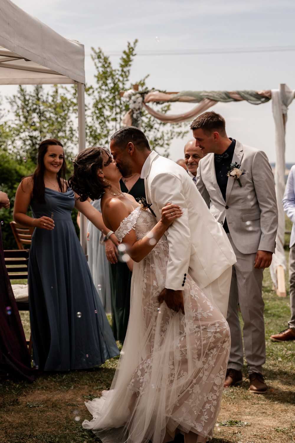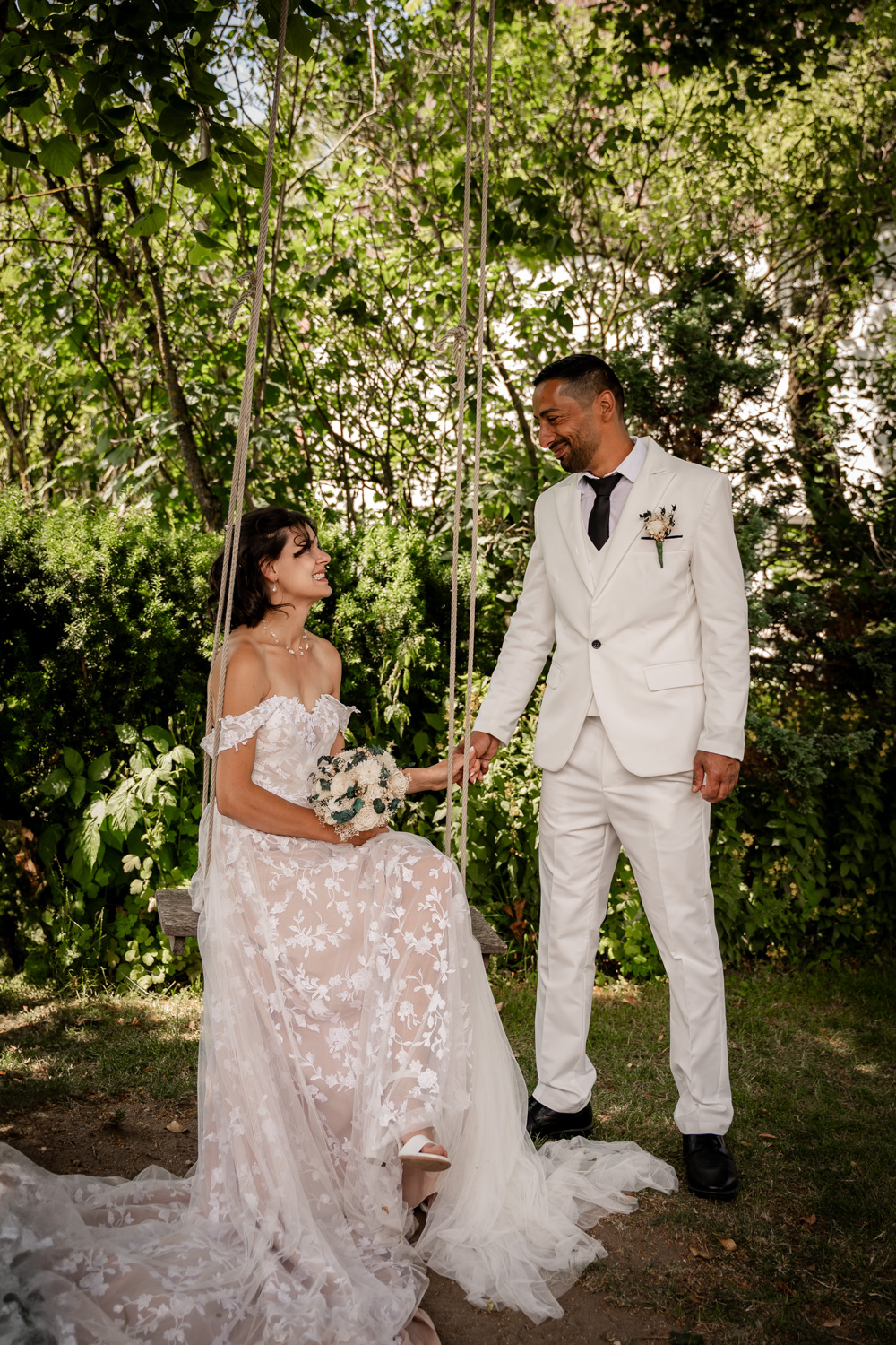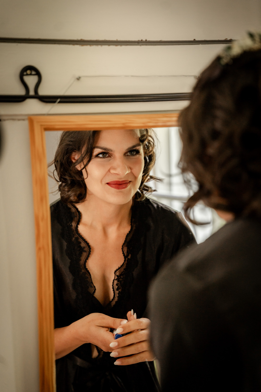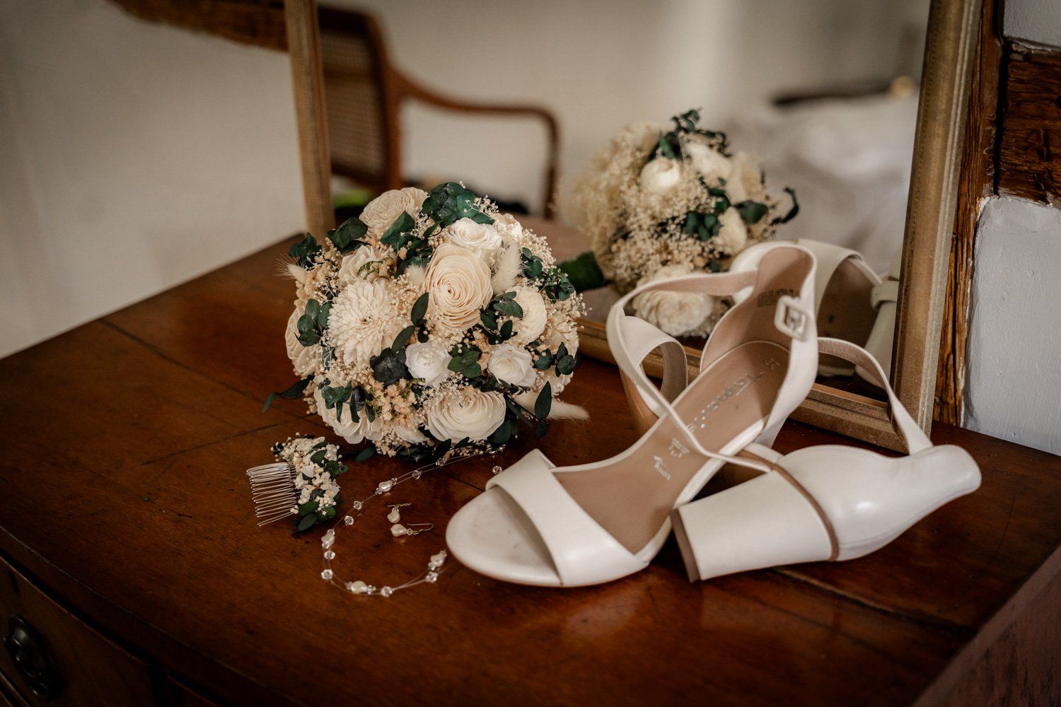 Die freie Trauung fand im weitläufigen Garten statt – ganz entspannt, mit Vogelgezwitscher und dieser ganz besonderen Sommerstille, die nur ländliche Orte haben. Nach der Zeremonie wurde Kaffee im Schatten der Bäume getrunken, gelacht, umarmt, erzählt.Das Getting Ready im Haus war etwas ganz Besonderes: Die lichtdurchfluteten Räume, antiken Möbel und liebevoll ausgewählten Details schufen eine Atmosphäre, in der man sich sofort wohlfühlte – edel, aber warm und persönlich. Ideal, um in Ruhe anzukommen, sich fertig zu machen, vielleicht sogar kurz durchzuatmen.