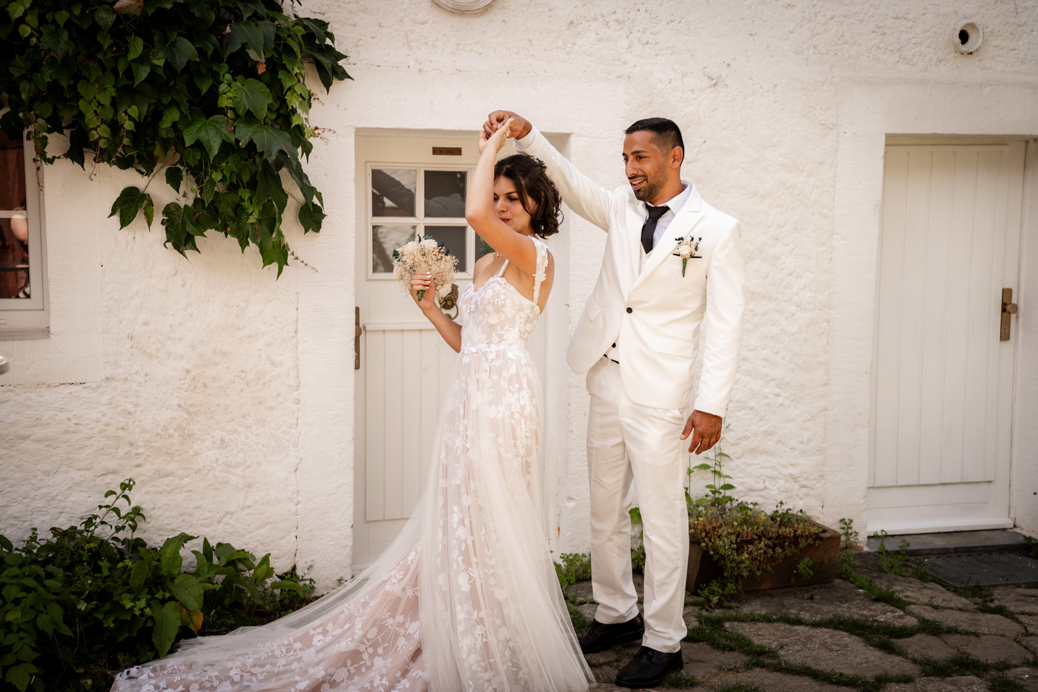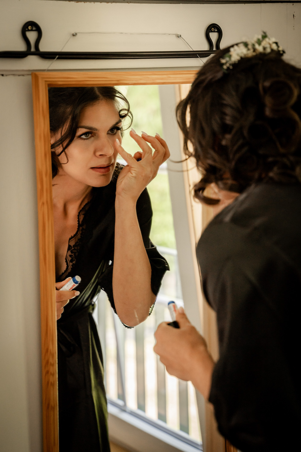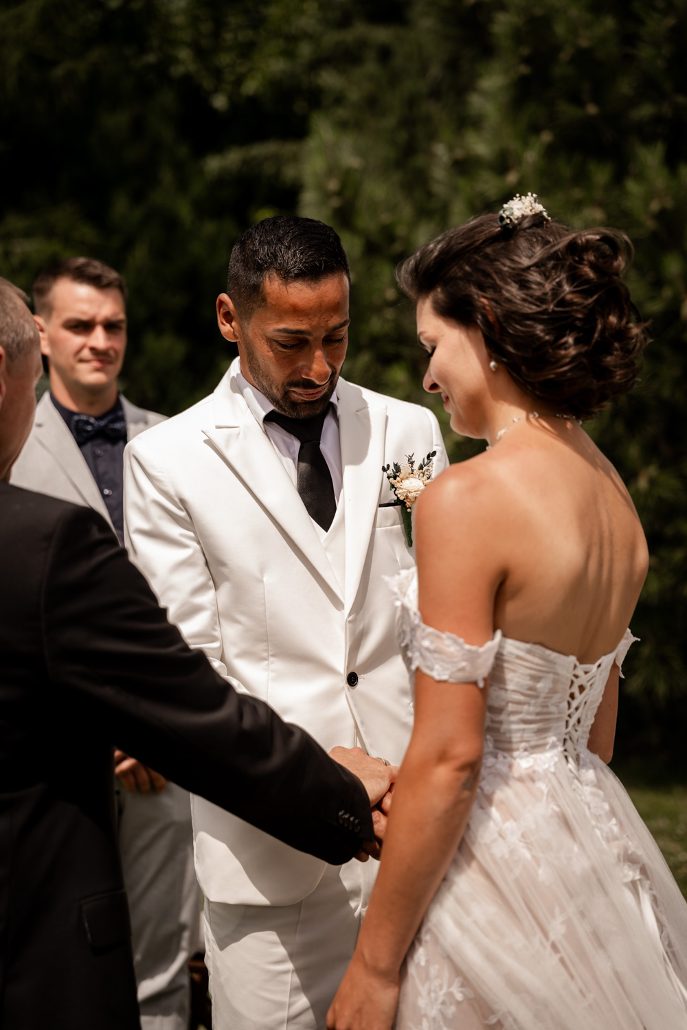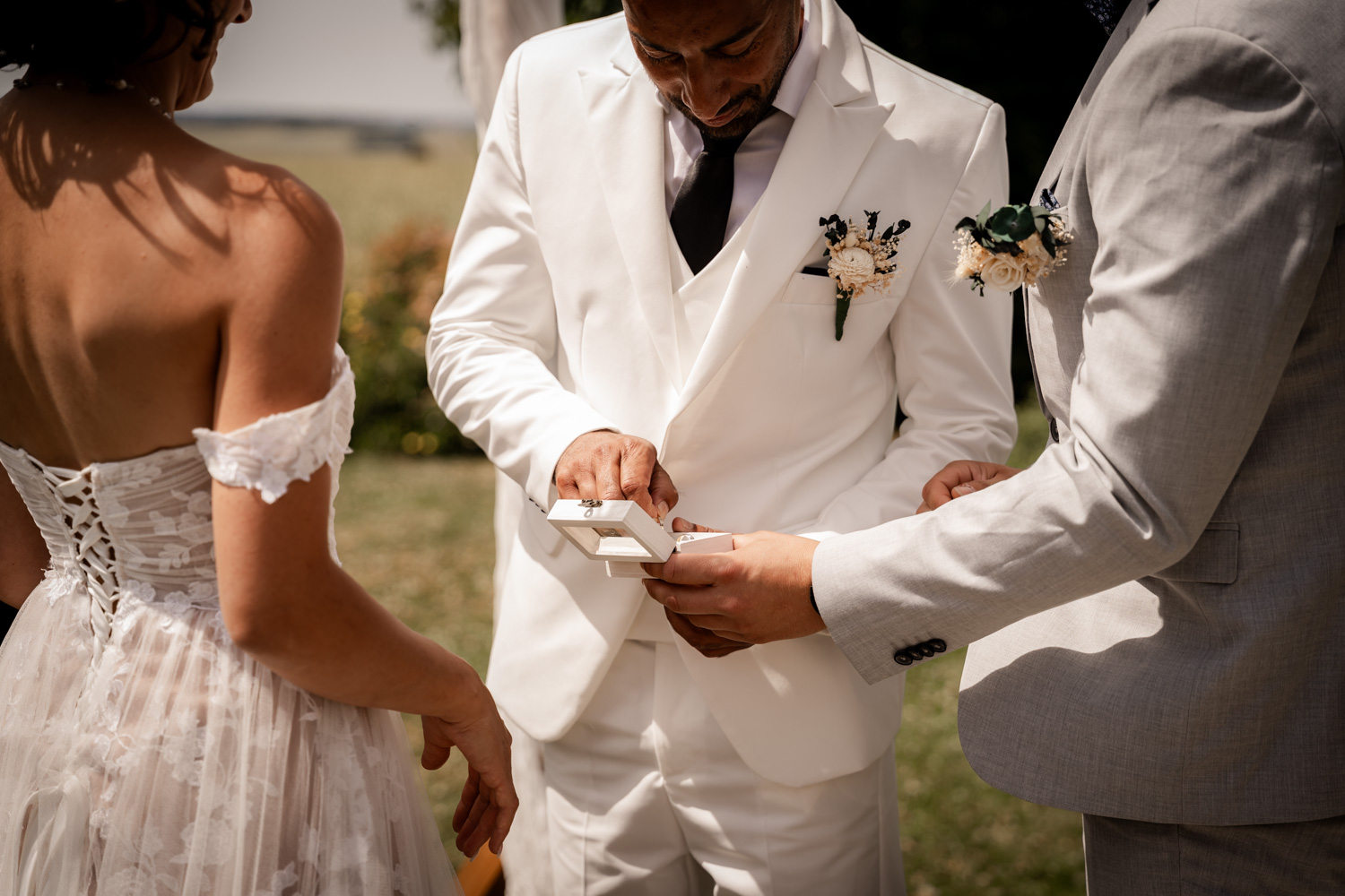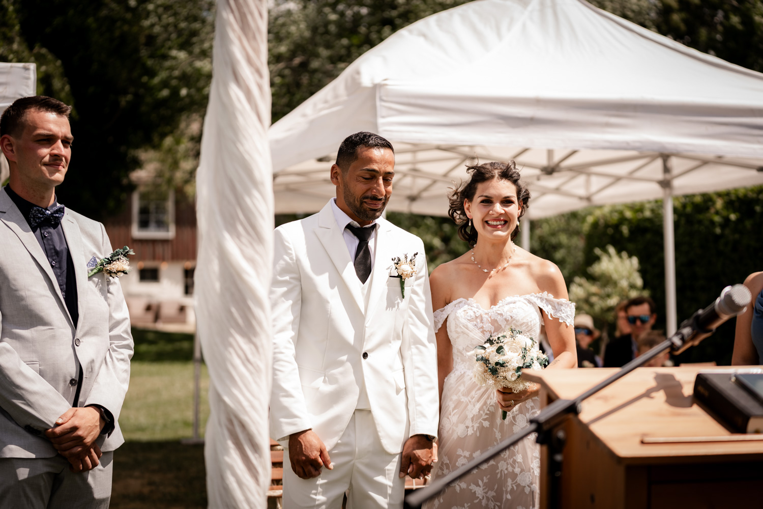 Die freie Trauung fand im weitläufigen Garten statt – ganz entspannt, mit Vogelgezwitscher und dieser ganz besonderen Sommerstille, die nur ländliche Orte haben. Nach der Zeremonie wurde Kaffee im Schatten der Bäume getrunken, gelacht, umarmt, erzählt.Das Getting Ready im Haus war etwas ganz Besonderes: Die lichtdurchfluteten Räume, antiken Möbel und liebevoll ausgewählten Details schufen eine Atmosphäre, in der man sich sofort wohlfühlte – edel, aber warm und persönlich. Ideal, um in Ruhe anzukommen, sich fertig zu machen, vielleicht sogar kurz durchzuatmen.