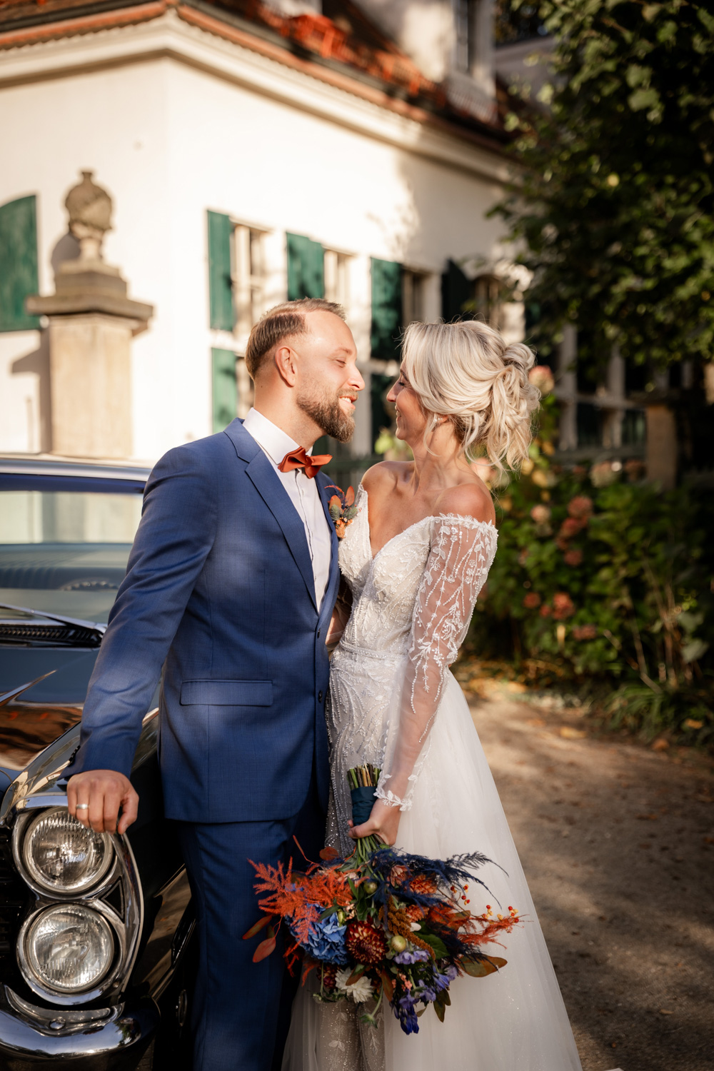 Das Anwesen versprüht historischen Charme, ohne altmodisch zu wirken: helle Räume mit hohen Fenstern, feine Stuckverzierungen, kunstvolle Wandmalereien und dieser zarte Hauch von französischem Flair. Draußen lädt der weitläufige Park mit alten Bäumen, Rosen und Weinreben zu Spaziergängen, Fotos und Momenten im goldenen Abendlicht ein – eine Kulisse, die wie gemacht ist für emotionale Hochzeitsfotografie.