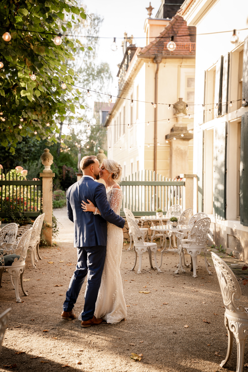 Lage: Die Villa Sorgenfrei liegt inmitten der Weinberge von Radebeul – nur wenige Minuten von Dresden entfernt und dennoch völlig losgelöst vom Trubel der Stadt. Zwischen alten Bäumen, Rebstöcken und barocker Architektur spürt man sofort dieses Gefühl von Ruhe und Zeitlosigkeit. Hier treffen sächsischer Wein, französische Leichtigkeit und die Geschichte eines alten Landhauses aufeinander – ein Ort, der wie geschaffen ist für intime, stilvolle Hochzeiten mit viel Atmosphäre.